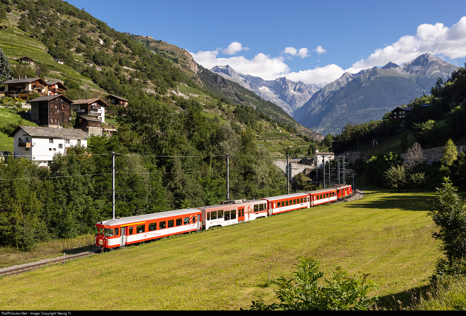 | Push-pull train of the Matterhorn-Gotthard-Bahn (MGBahn) R 323 from Visp to Zermatt near Neubrück, between Visp and Ackersand, with leading cab car ABt # 4195 and cogwheel baggage railcar Deh 4/4 # 55 "Brig" shoving in the rear. The 1032 kW Deh 4/4 # 55 was built in 1972 by SLM, SIG and BBC for the Furka-Oberalp-Bahn (FO), has a aluminium carbody and maximum 60 km/h velocity (30 km/h on cogwheel sections). |