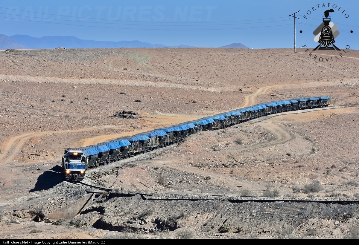 One of the iron trains that daily cross the Atacama area, going down a steep slope towards Empalme Norte and then take the railway branch to the CAP Los Colorados mining site. An EMD demonstrator locomotive leads the train, on a meter gauge track, GT46AC model with EMD corporative blue / grey livery - scheme, currently in the city of Vallenar, under the control of FERRONOR railway company for hauling iron trains between Los Colorados mine in north of Vallenar, and Guacolda port in city of Huasco.
