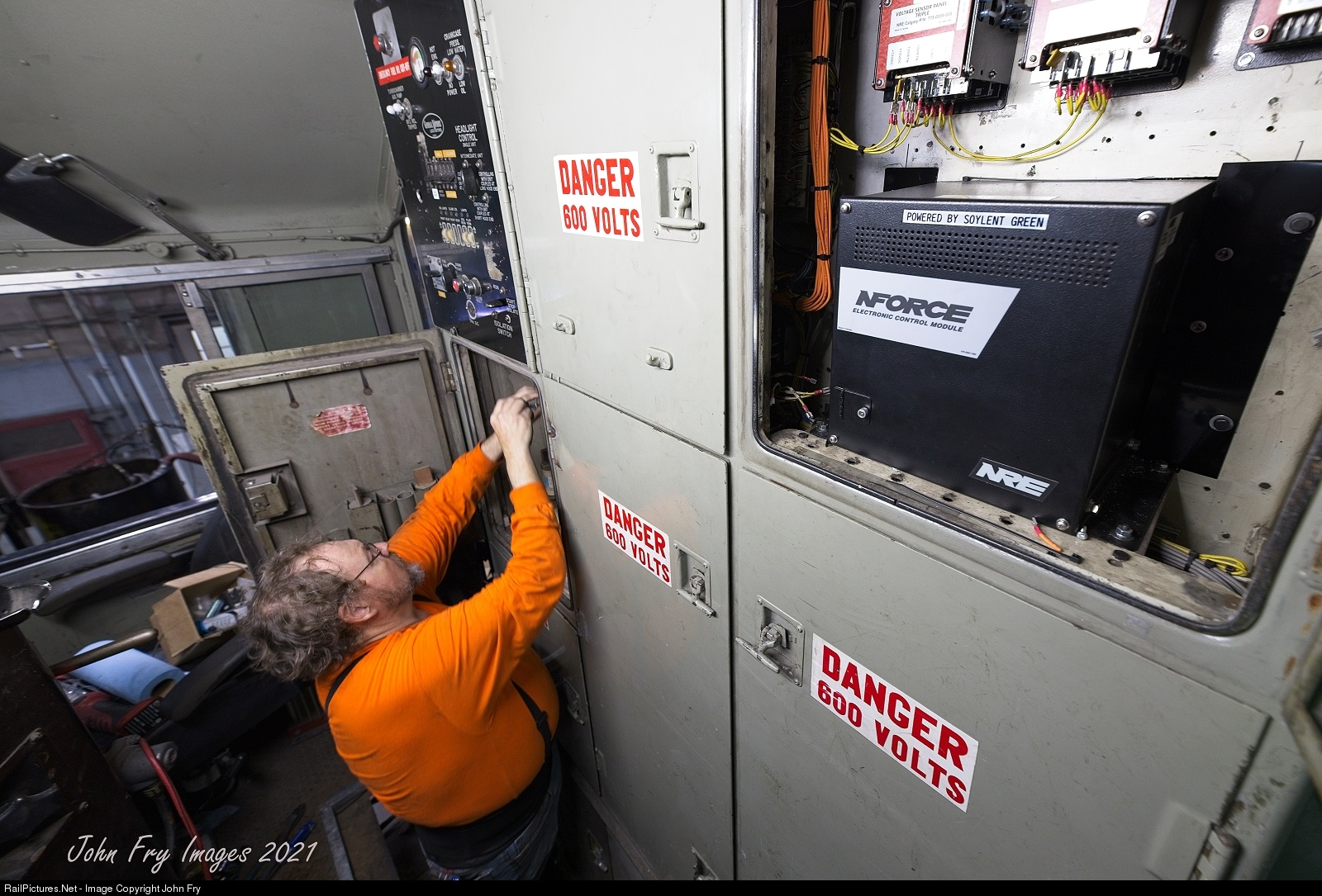 The shop forces in Owosso take excellent care of the Great Lakes Central's venerable EMD fleet. Kevin Wood, a contractor, is installing upgraded electrical controls to one of the recently acquired SD35s that came from Montana Rail Link, and NW before that. The open electrical cabinet door gives us a clue as to the secret ingredient for the new electronics.
