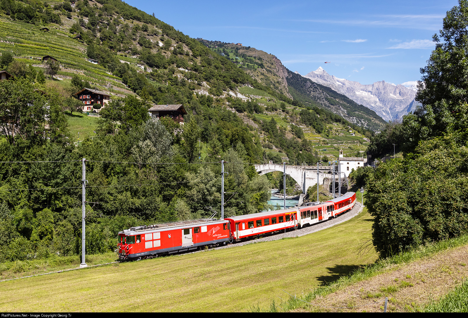 | Cogwheel railcar Deh 4/4 # 23 "Randa" of the Matterhorn-Gotthard-Bahn (MGBahn) is pulling the push-pull regional train R 331 from Visp to Zermatt near Neubrück, between Visp and Ackersand. The railcar with aluminium body was built in 1976 by SLM, SIG and SAAS for the Brig-Visp-Zermatt-Bahn (BVZ). 1094 kW maximum velocity 65 km/h (35 km/h on cogwheel sections). In the background the 3934 meter high Bietschorn, north of the Rhone valley. The chapel "Niwu Briggu" (new bridge) dates from 1727, the stone arch bridge "Rittibrigga" over the Vispe from 1599. |