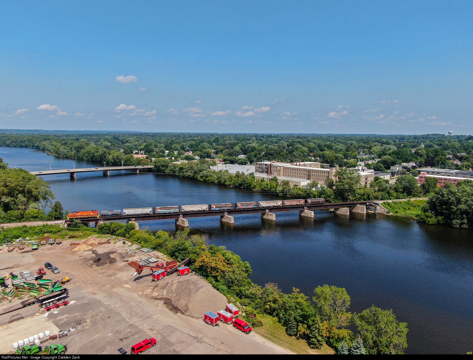 GR 2104 Bounces across the Grand River Bridge with 9 cars for CSX. The tank car is from Amway in Ada, while the rest of the 8 cars are from King Milling in Lowell. The Alma based GRE crew will have to wait at Fuller Diamond for the MQT Z151 to go north before entering Fuller Yard and making 2 runs to the CMRY interchange to finish their nearly 12 hour day.