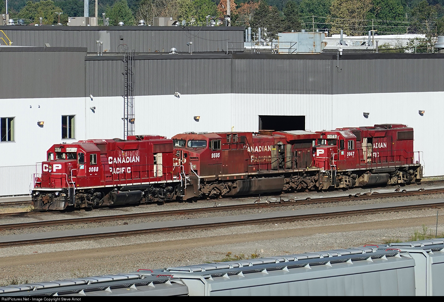 GP38-2 3088, AC4400CW 9595 and GP38-2 3047 parked at Port Coquitlam Yard’s diesel shop.