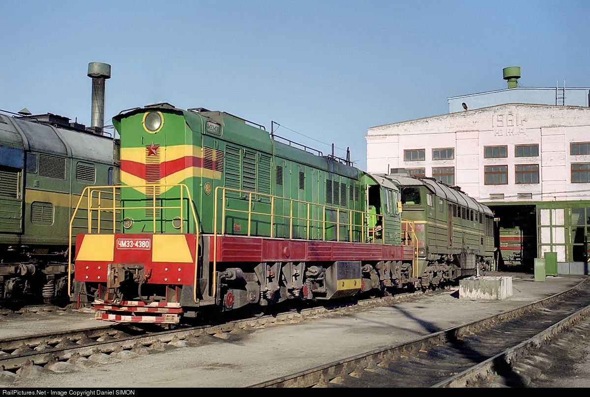 The diesel locomotive #4380 is waiting for a next assignment at the Grebenka shed. The ČKD ChME3 is a six axle road-switcher diesel-electric locomotive class built by ČKD in the former Czechoslovakia. The class was used primarily for shunting and mainline duties. Units have been operated by Russia, Belarus, Ukraine (as class ЧМЭ3, transliteration ChME3) and other ex-Soviet bloc countries, in Czechoslovakia (as class T669.0, T669.1 and T669.5, later as ŽSR 770 and ČD 770 in Slovakia and the Czech Republic), on industrial railways in Poland (S200), in Albania (HSH T669.1), Iraq (DES 3101), Syria (LDE 1500) and in India (DEC 120).