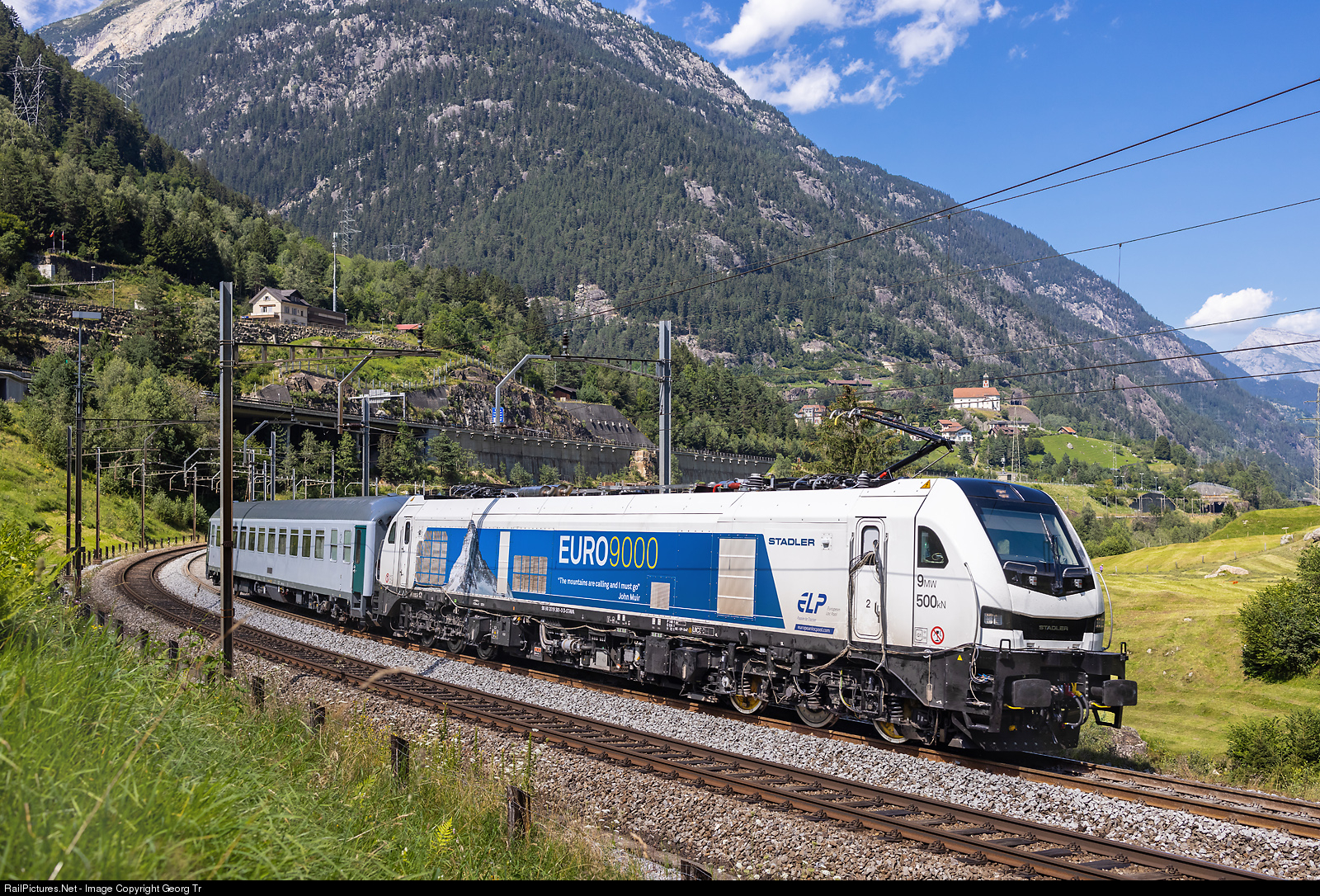 This days, the sister EURO9000 locomotive of # 300, the # 301, made test runs on the Gotthard mountain line for the wheel/rail forces. For this purpose, the locomotive is equipped with 2 measuring axles on the uphill bogie (first and third axle) and a large number of cables are attached. A couchette car Bcm of the Deutsche Bahn serves for the staff and for braking. This is one of the world's most powerful hybrid electric/diesel sixaxle locomotives built by StadlerRail in Valencia/Spain, owned by European Loc Pool AG, Frauenfeld/Switzerland (ELP). EURO9000 # 301 is running at about 80 km/h through the 300 meter radius Wattinger curve between Gurtnellen and Wassen, with the village and church of Wassen in the background. The building visible above the car is the Wassen station building, where the train will pass in about one minute in the opposite direction, running through the loops at Wassen.