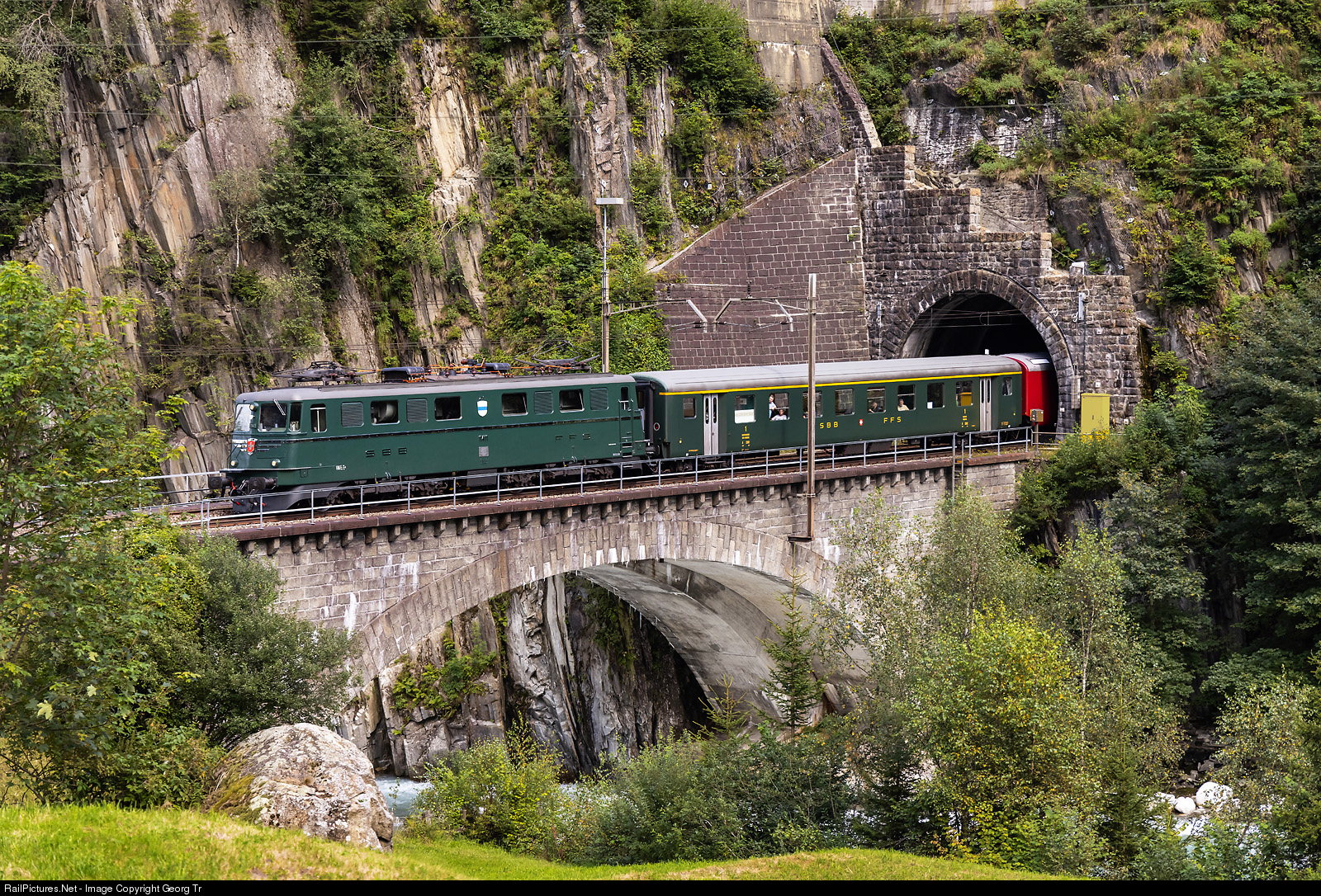 | "Erlebniszug San Gottardo" (Adventure train San Gottardo) of SBB Historic, with iconic Gotthard locomotive Ae 6/6 # 11411 "Zug", running as train 31472 from Lavorgo over the Gotthard mountain line to Erstfeld, is leaving the Wattinger loop tunnel and crossing the lower Wattinger bridge over the Reuss river, between Wassen and Gurtnellen. |