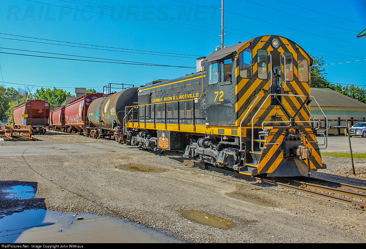 ALCO Safari Day 5, LA&L: On a beautiful August morning, LAL 72 makes a trip to the extreme end of track in Lakeville to retrieve a couple cars, the other side of the trees is Lake Conesus. LA&L is 80 years old this year, built in 1941, making it one of the oldest diesels used every day in revenue service.