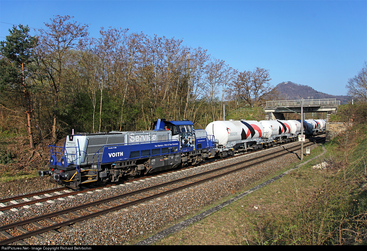 | Voith Gravita are diesel-hydraulic locomotives built by Voith in Kiel (Germany). The locomotive, rented by HzL, is pulling a freight train from Dotternhausen to Singen. |