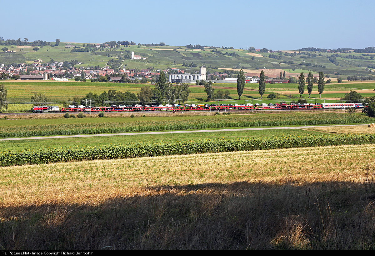 | Diesellocomotive 218 256 in the colours of the "Graz Köflacher Bahn" (GKB), now owned and operated by NESA, is en route with a diverted motorail train Hamburg – Lörrach. |