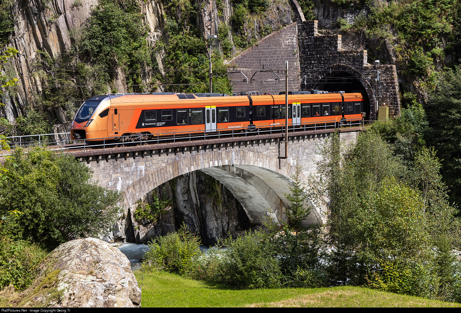 | "Traverso" train RABe 526 # 119/219 of the Südostbahn (SOB) i sleaving the Wattinger loop tunnel and crossing the lower Wattinger bridge over the Reuss on the Gotthard north ramp between Wassen and Gurtnellen, running as "Treno Gottardo" IR 2328 of the line IR 26 from Locarno via Bellinzona-Airolo-Göschenen-Erstfeld-Arth Goldau-Lucerne-Olten to Basel. The SOB is runnig this trains in co-operation with the SBB since change of timetable in december 2020. |