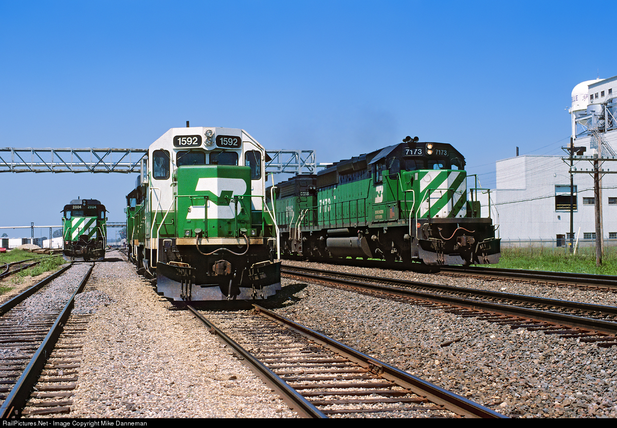 BN “Expediter” intermodal train 42, on the right, speeds by local power at Rochelle, Illinois, on the afternoon of August 12, 1995. BN No. 1592 is a former Northern Pacific EMD GP18 (No. 377) that was remanufactured and modernized into a GP28P in March 1993.