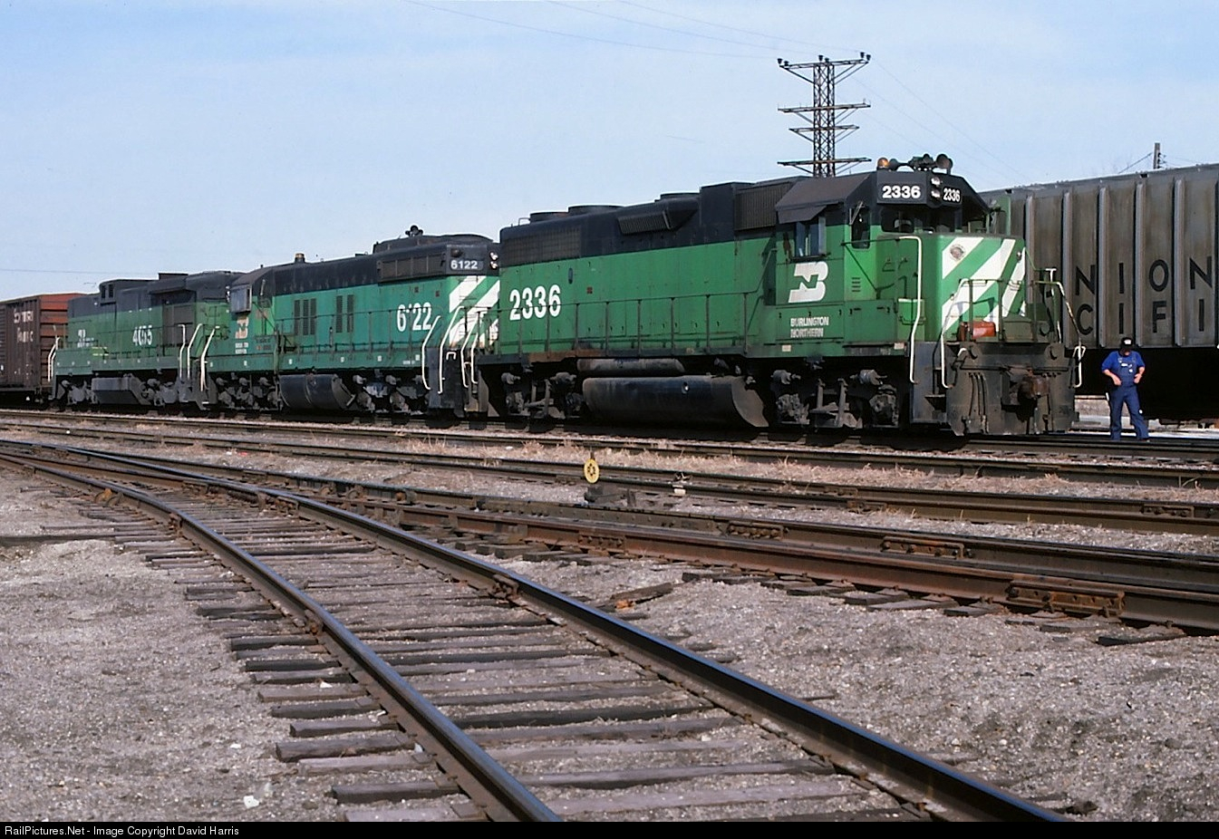 This southbound long-range local has a new crew and is about to resume its trek. A few miles south of Fort Scott, at a spot called Edward - population one switch and zero people - the train will enter the Afton Sub and head for the yard at Columbus, KS. Interesting power, with ex-Frisco 2336 (Blt March 1972) leading ex-GN SD9 6122 (Blt May 1958) and BN B30-7A 4055 (Blt October 1983).