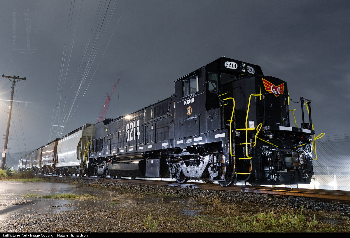 KXHR 8214 sits dormant with a cut of empty cement hoppers on the outskirts of the University of Tennessee Knoxville campus amid an increasingly common extreme torrential downpour.