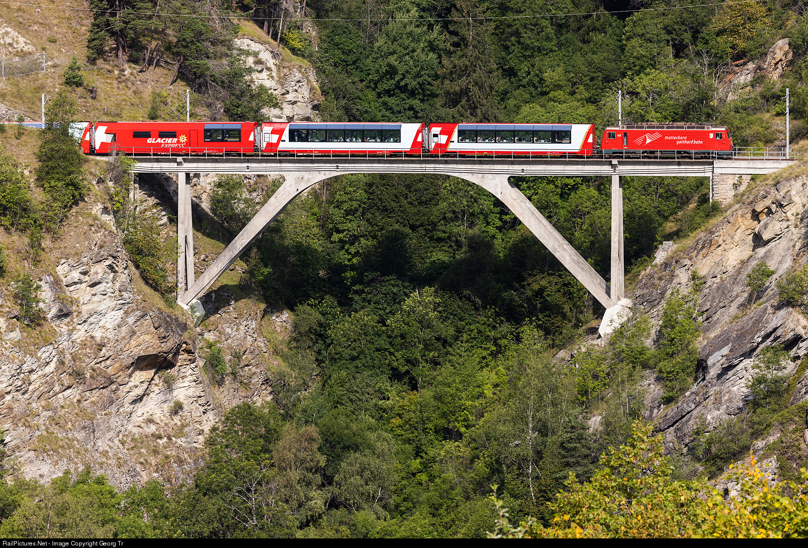 HGe 4/4 II # 102 of the Matterhorn-Gotthard-Bahn (MGBahn) is pulling the PE 902 GLACIER EXPRESS from Zermatt to St.Moritz over the 66 meter long Mühlebach viadukt between Kalpetran and Stalden-Saas. This concrete bridge was built in 1959, replacing a bow truss bridge of 1891.
