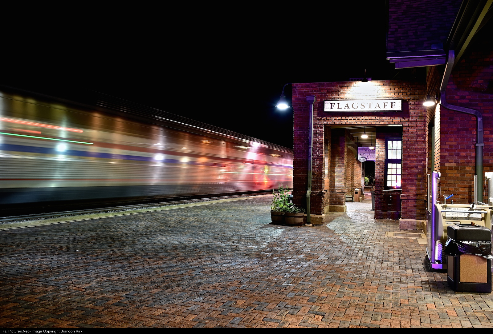 | Arriving around 10:00 pm, Amtrak's Southwest Chief stops at the Flagstaff station to drop off and pick up passengers. It's a busy night and in a short amount of time, the chief is gaining speed as it departs making several more stops before reaching Los Angeles California. |