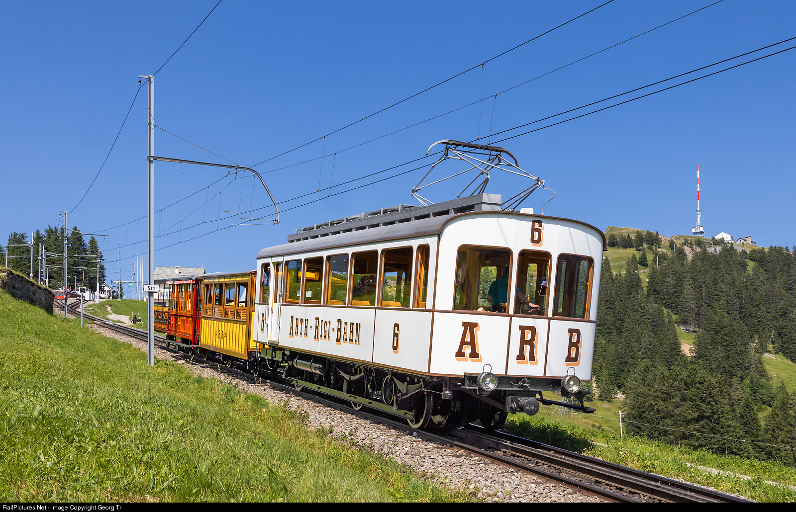 Worldwide oldest operational electric cogwheel railcar BCFhe 2/3 # 6 of the Rigi Bahnen, built in 1911 by SLM, SWS and MFO for the Arth-Rigi-Bahn (ARB), is running up the mountain as train 159 from Arth Goldau to Rigi Kulm, between Rigi Wölfertschen-First and Rigi Staffel, with Rigi Kulm on the right. The cars are yellow B # 35 of 1899, red B # 5 of 1871 and brown B # 11 "Bambus" of 1889.