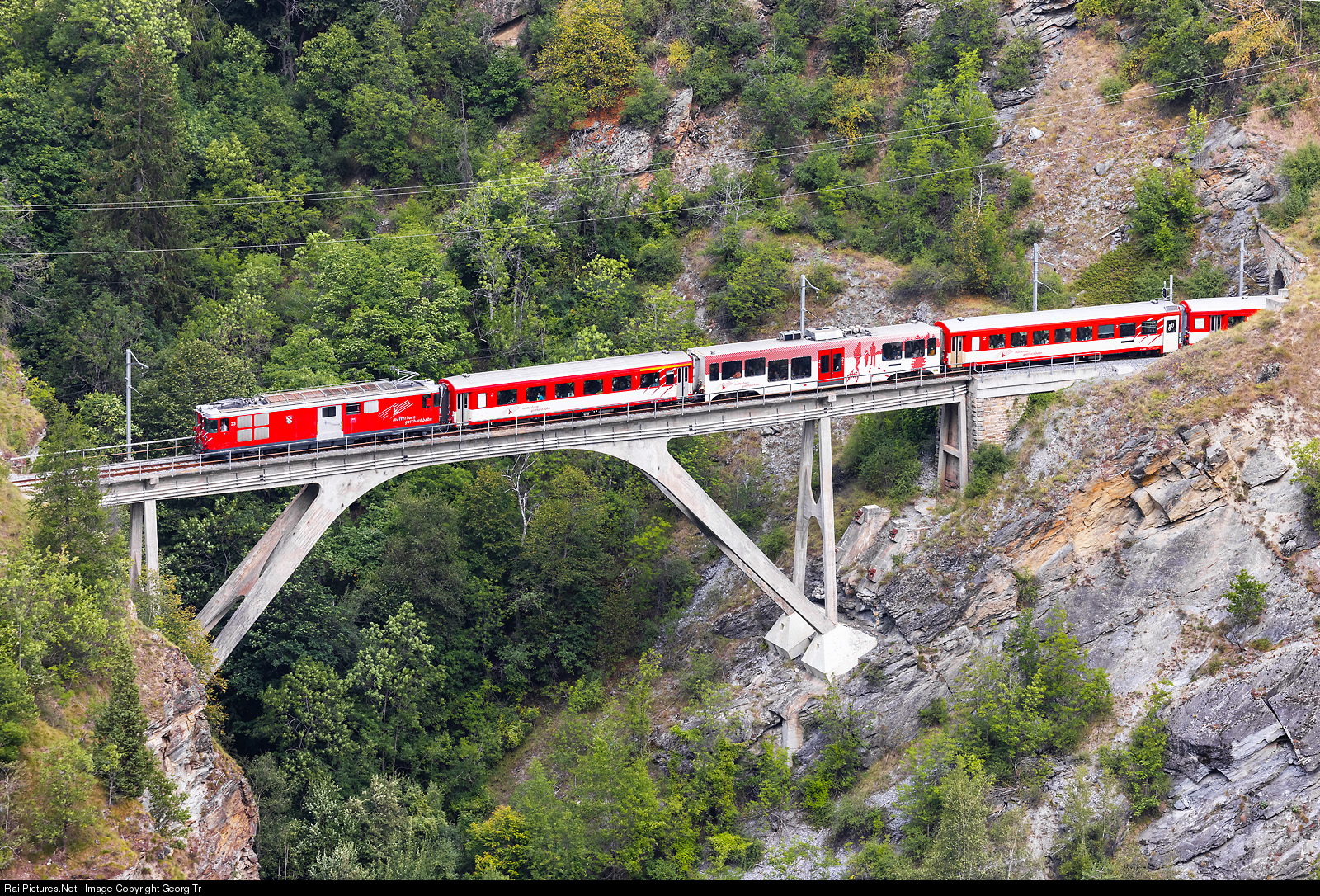 | Regional train R 331 of the Matterhorn-Gotthard-Bahn (MGBahn) from Visp to Zermatt is crossing the 66 meter long concrete Mühlebach viaduct between Stalden-Saas and Kalpetran. This viaduct was built in 1959 new in concrete, replacing a bow truss bridge of 1891. The cogwheel railcar Deh 4/4 # 23 "Randa", built in 1975 for the Brig-Visp-Zermatt Bahn (BVZ) is pulling the 4 car push-pull train, which has a partly lowfloor multifunction car of StadlerRail in the consist. |