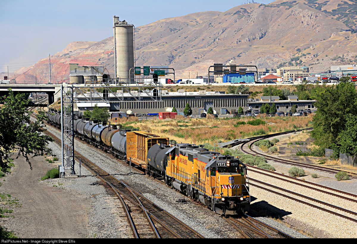 | The normal duet of GP15's on the Chevron local has been broken on this afternoon. A GP38N is in the mix 578. Both units are from fallen flags, absorbed into the Union Pacific. 573 was Missouri Pacific, and 578 was Southern Pacific. |
