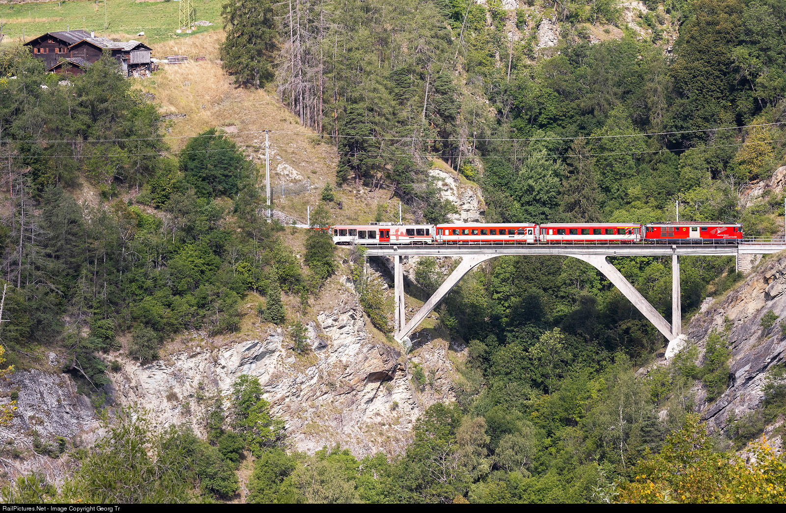 | Cogwhel railcar Deh 4/4 # 55 "Brig" of the Matterhorn-Gotthard-Bahn (MGBahn), built in 1972 by SLM, SIG and BBC for the Furka-Oberalp-Bahn (FO), is shoving the regional train R 323 from Visp to Zermatt over the 66 meter long Mühlebach viaduct between Stalden-Saas and Kalpetran. |