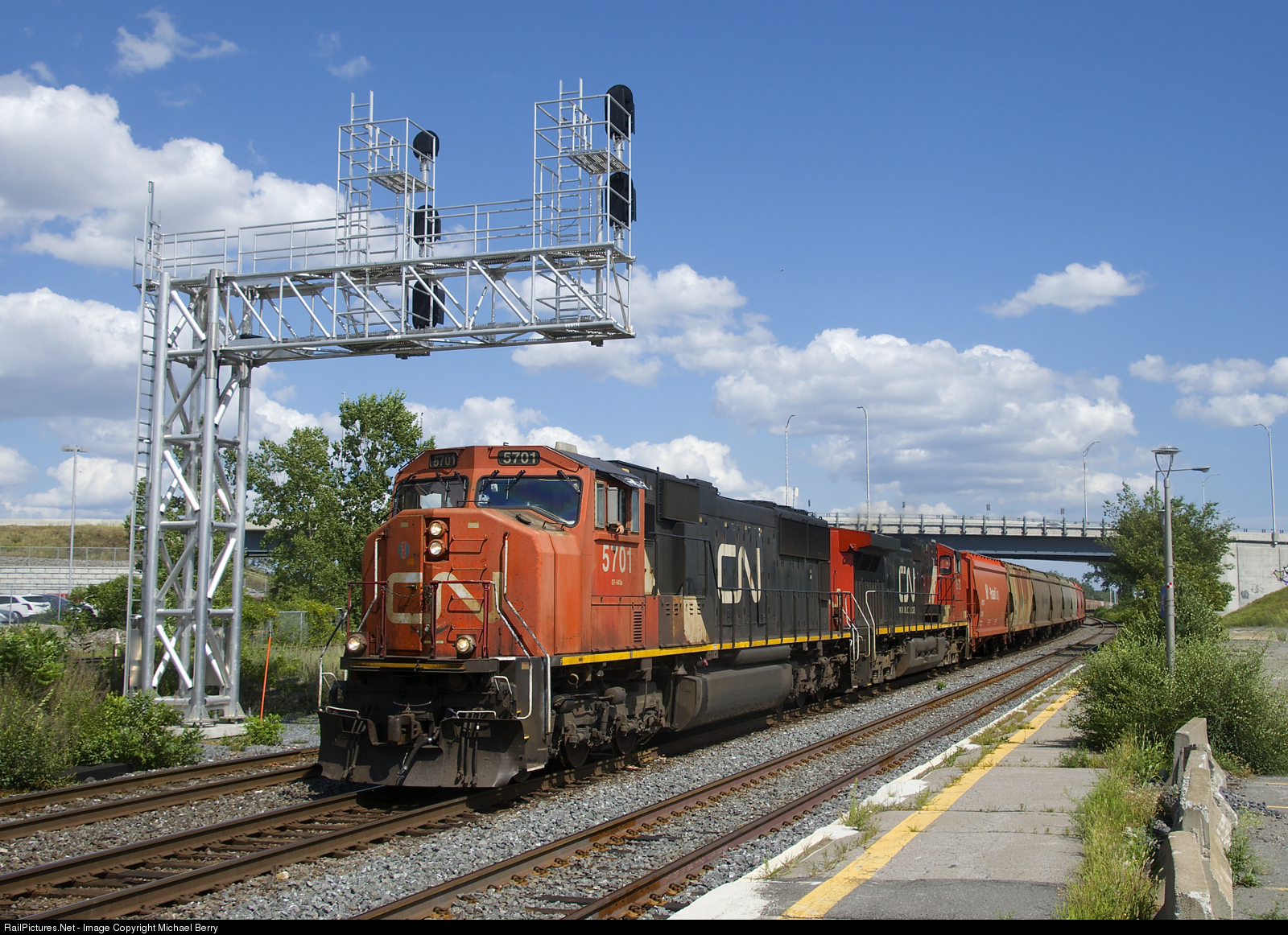 CN 731 has CN 5701, CN 2672 and 177 empty potash cars at it passes under a relatively new signal gantry in Dorval.