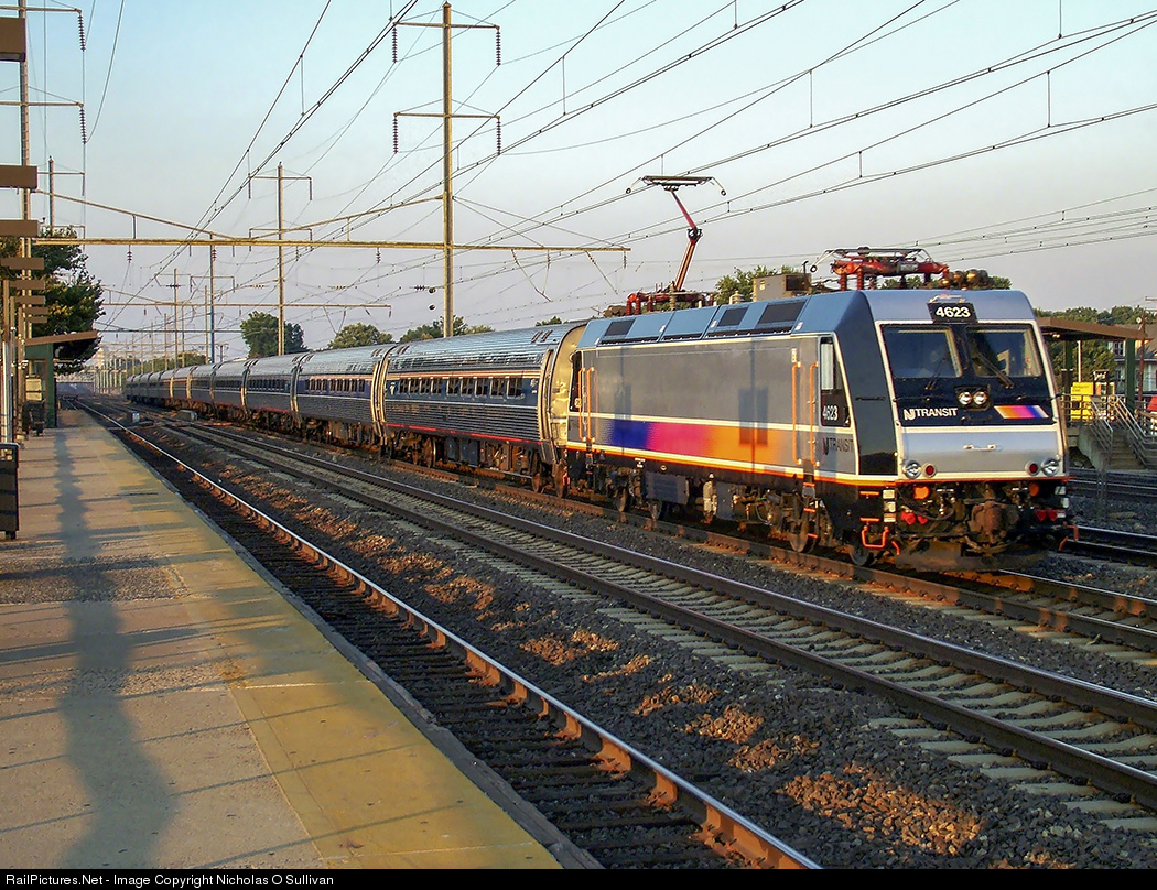 Clocker: A southbound (Amtrak)/westbound (NJT) "Clocker" service train expresses by on Northeast Corridor Track #3 from New York Penn Station bound for Philadelphia. This service, for NJT and Amtrak customers, would end a few weeks later on October 28, 2005. In the final years of this service, trains used NJT ALP46 locomotives.