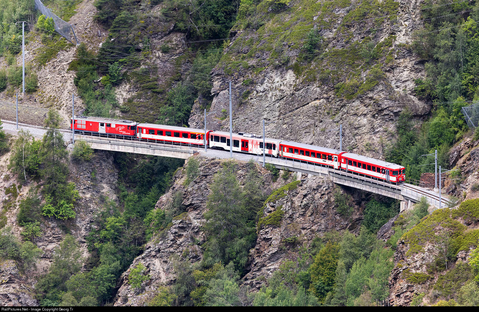 | Regional train R 332 of the Matterhorn-Gotthard-Bahn (MGBahn) from Zermatt to Visp in the gorge of the Matter Vispa between Kalpetran and Stalden-Saas. The cogwheel railcar Deh 4/4 # 23 "Randa", built in 1975 for the Brig-Visp-Zermatt Bahn (BVZ) is shoving the 4 car push-pull train, which has a partly lowfloor multifuntion car of StadlerRail in the consist. |