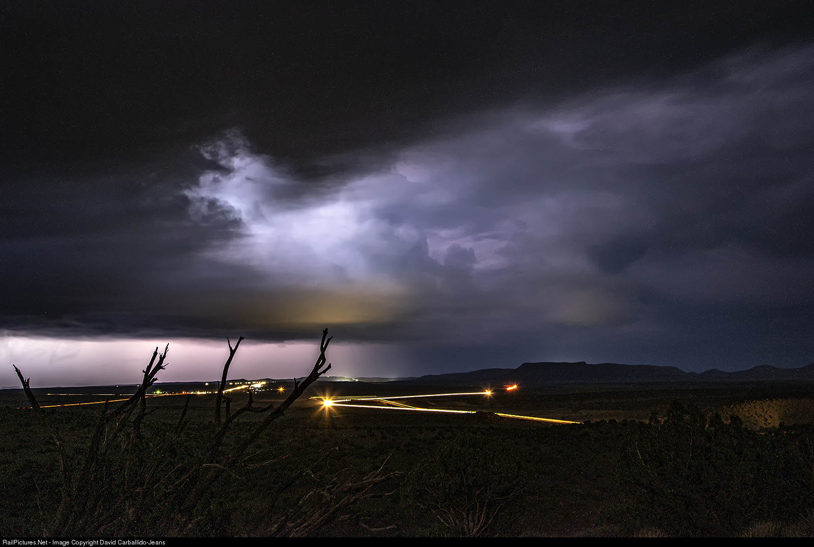 Looking from the top of Crozier Canyon, a monsoon storm produces a stellar lightning show over Truxton. Trains are still moving as the weather conditions worsen. Seligman Sub West Dispatcher #11 starts issuing "high wind warnings" of wind gust of 65 MPH. In the distance, the hot Z WSPNBY9 races westward under the Truxton Flyover as a slow moving Q BARNSA6 starts to cross over the flyover.