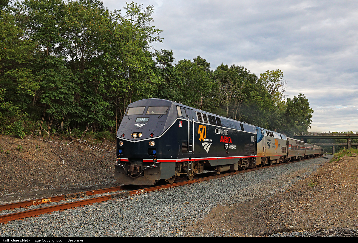 | A set of Amtrak 50th Anniversary units lead the Boston Section of the WB Lake Shore Limited. The train is about 10 miles out of Rensselaer where it will be combined with the NY section for the trip to Chicago. Amtrak 100 in the midnight blue 50th scheme leads Amtrak 46 in the standard Phase V scheme with the 50th logo. |