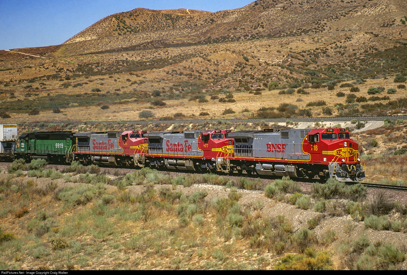 A Burlington Northern Santa Fe Dash 9-44CW (718), a pair of ex-Santa Fe Dash 8-40CWs (877 and 895) and a Burlington Northern SD40-2 (6919) are in charge of hot intermodal train Z-SBDALT1-20, as it climbs Cajon Pass on its way from San Bernardino to Alliance, Texas, on August 20, 2000.