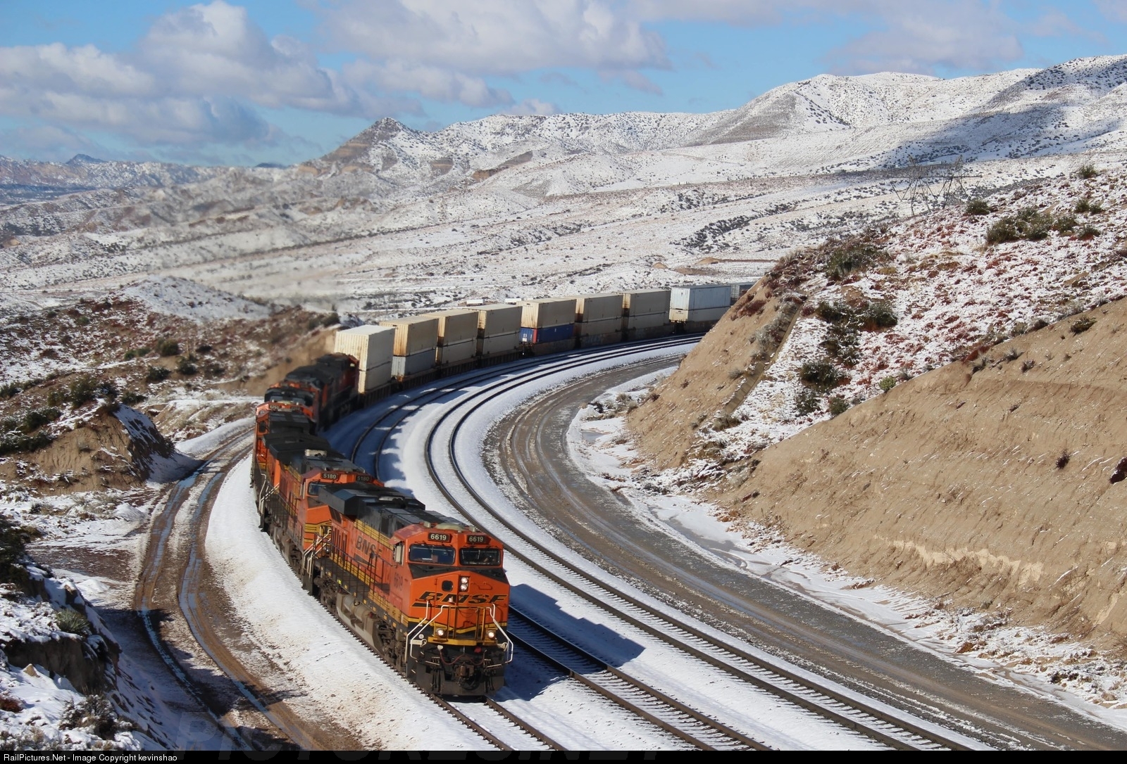 Intermodal train led by BNSF 6619 climbing up snowy Cajon Pass