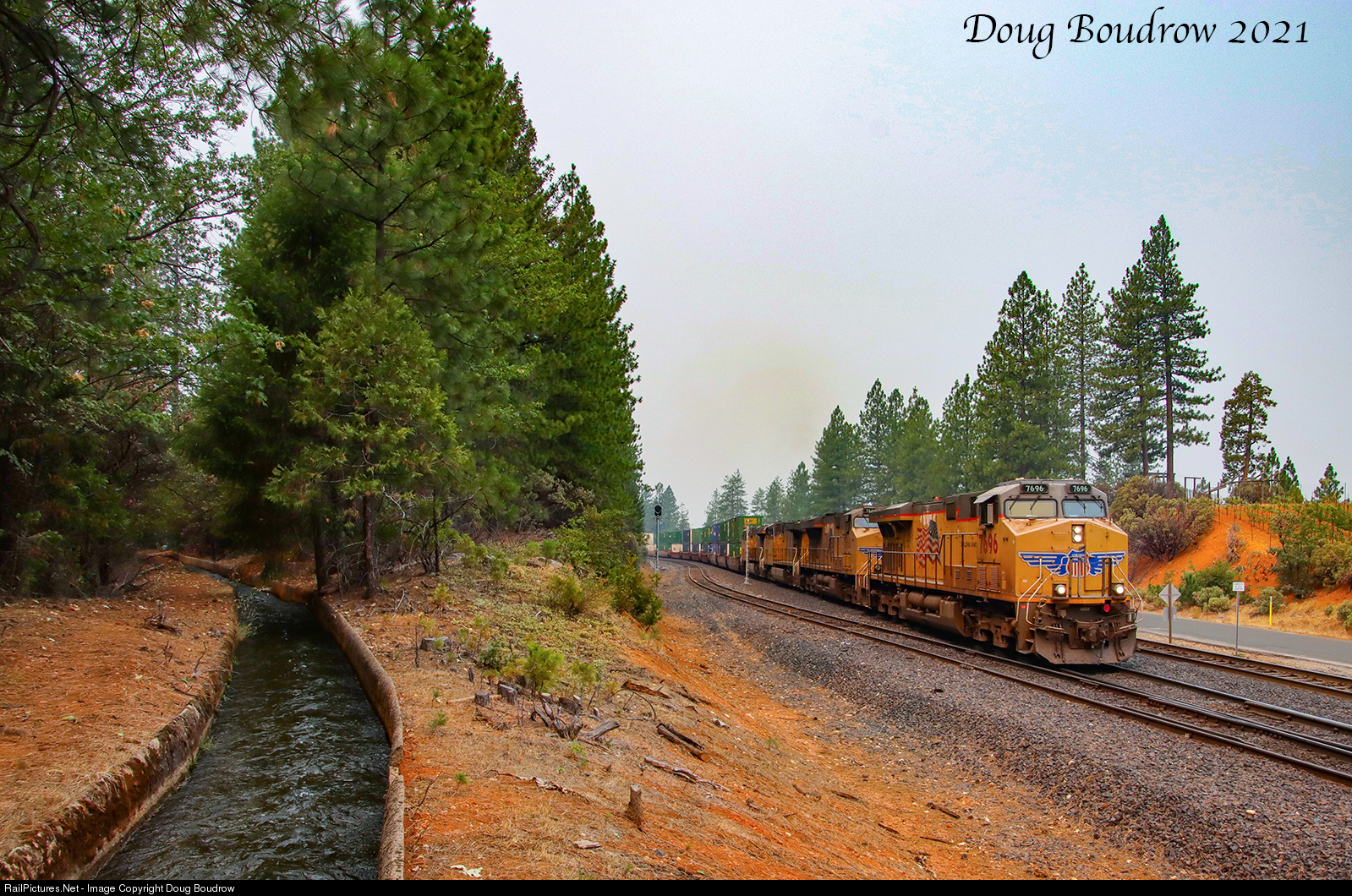 An Eastbound intermodal train is seen passing Gold Run on the way up to Donner Pass. The smoke from the Dixie Fire was thick causing the air to be hazy.