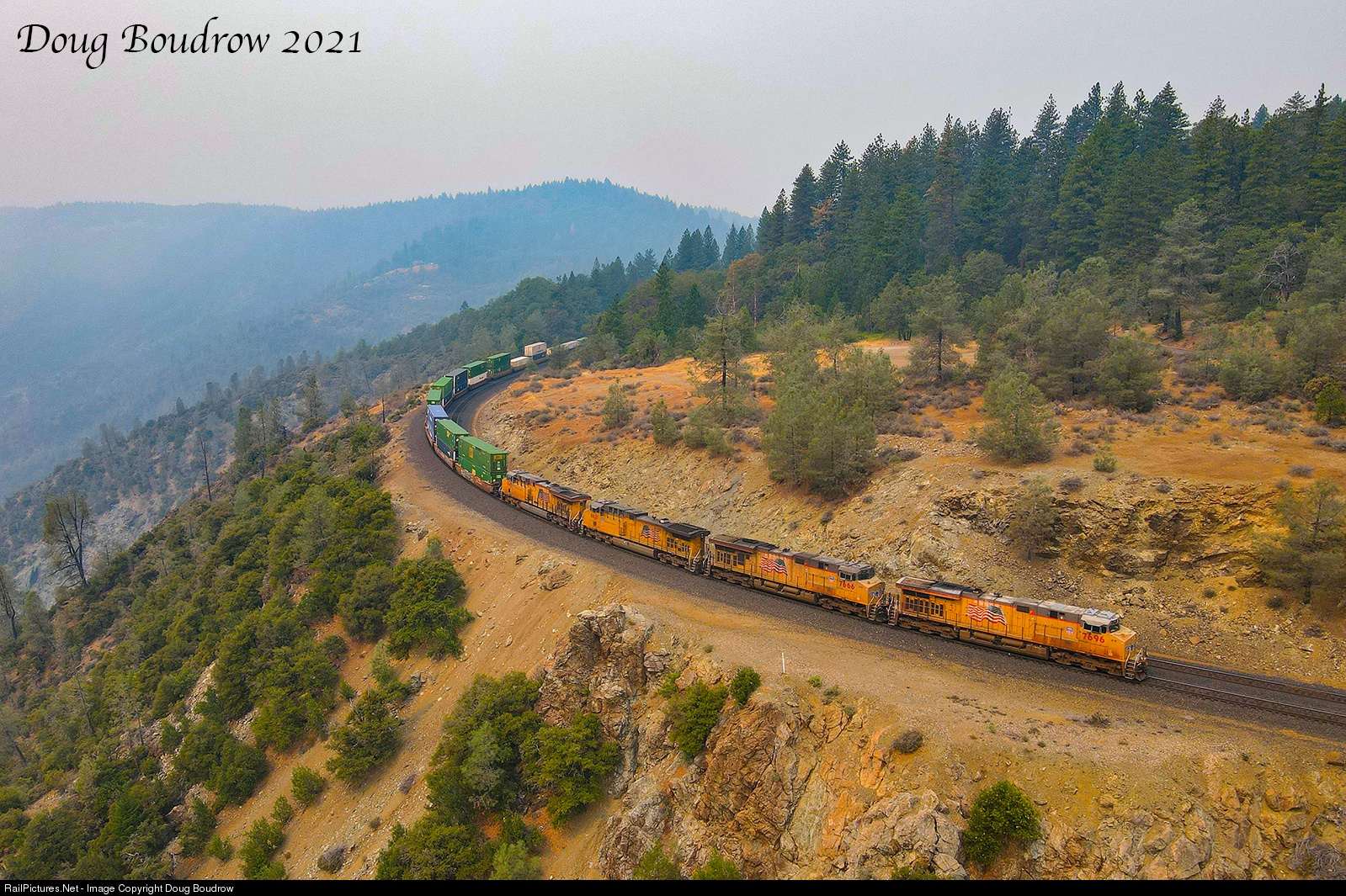 | An Eastbound Union Pacific Z train is seen rounding the curves in Casa Loma above the American River Canyon. The smoke is thick in the air from the ongoing wildfires in the area, including the Dixie Fire which has grown to be the second-largest wildfire in California history. |