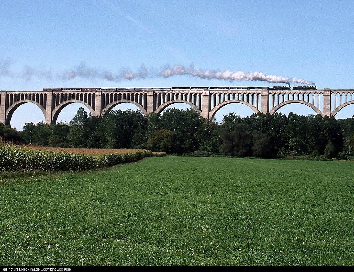 A Steamtown 4-6-2/2-8-2 doubleheader, pulling 12 cars and crossing the great Nicholson Bridge in a photo runby. I recall detraining and piling into a school bus, which deposited us in a farmer's field on the east side of the bridge.
