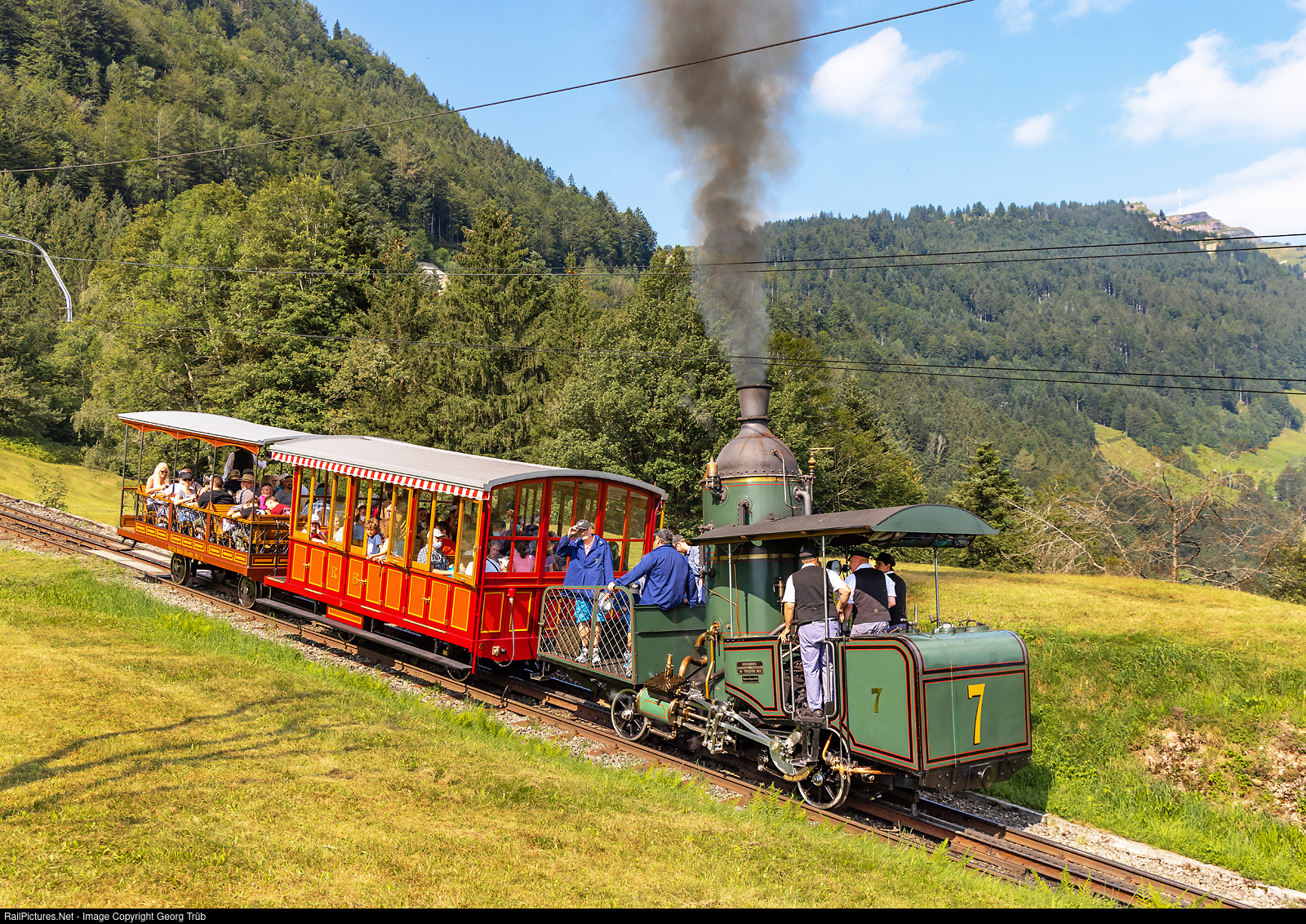 Cogwheel steamlocomotive H 1/2 # 7 of the Rigi Bahnen (built by SLM Winterthur in 1873, part of the collection of the Swiss Museum of Transport in Lucerne) is running up from Arth Goldau to Rigi Kulm, above Kräbel, with car B # 5 of 1871 and B # 11 "Bambus" of 1889 (some parts), rebuilt in 1996. There were several rides with locomotive # 7 during summer 2021 for celebrating 150 years of the first mountain railway in Europe.