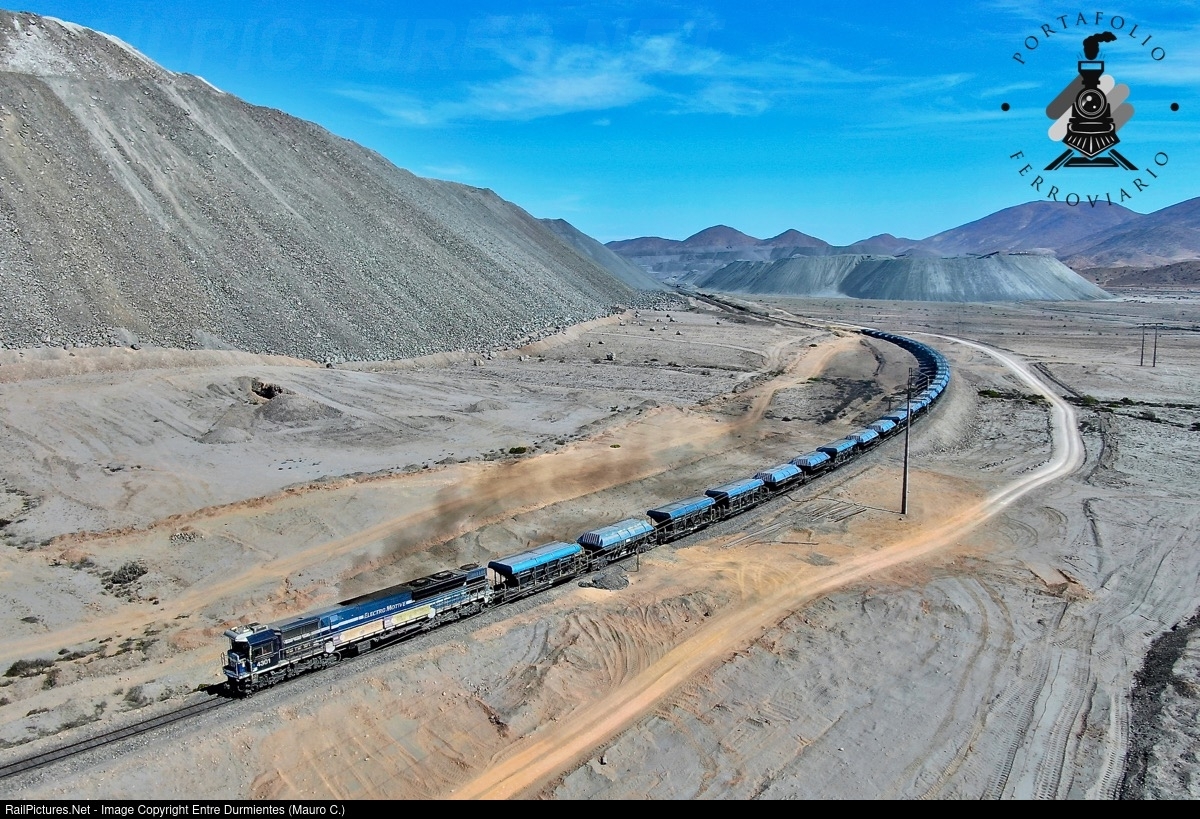 One of the FERRONOR iron trains that daily cross the Atacama area, departure from the CAP Los Colorados iron ore deposit, beginning the journey to the Guacolda II port, in Huasco. An EMD demonstrator locomotive leads the train, on a meter gauge track, GT46AC model with EMD corporative blue / grey livery - scheme, currently in the city of Vallenar, under the control of FERRONOR railway company for hauling iron trains between Los Colorados mine in north of Vallenar, and Guacolda port in city of Huasco.