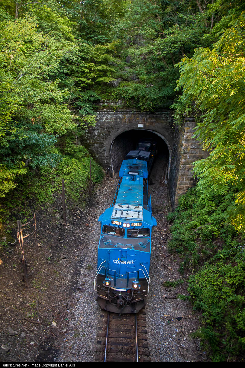 Manifest NS 393 thunders out of Pembroke tunnel with the Conrail on point.