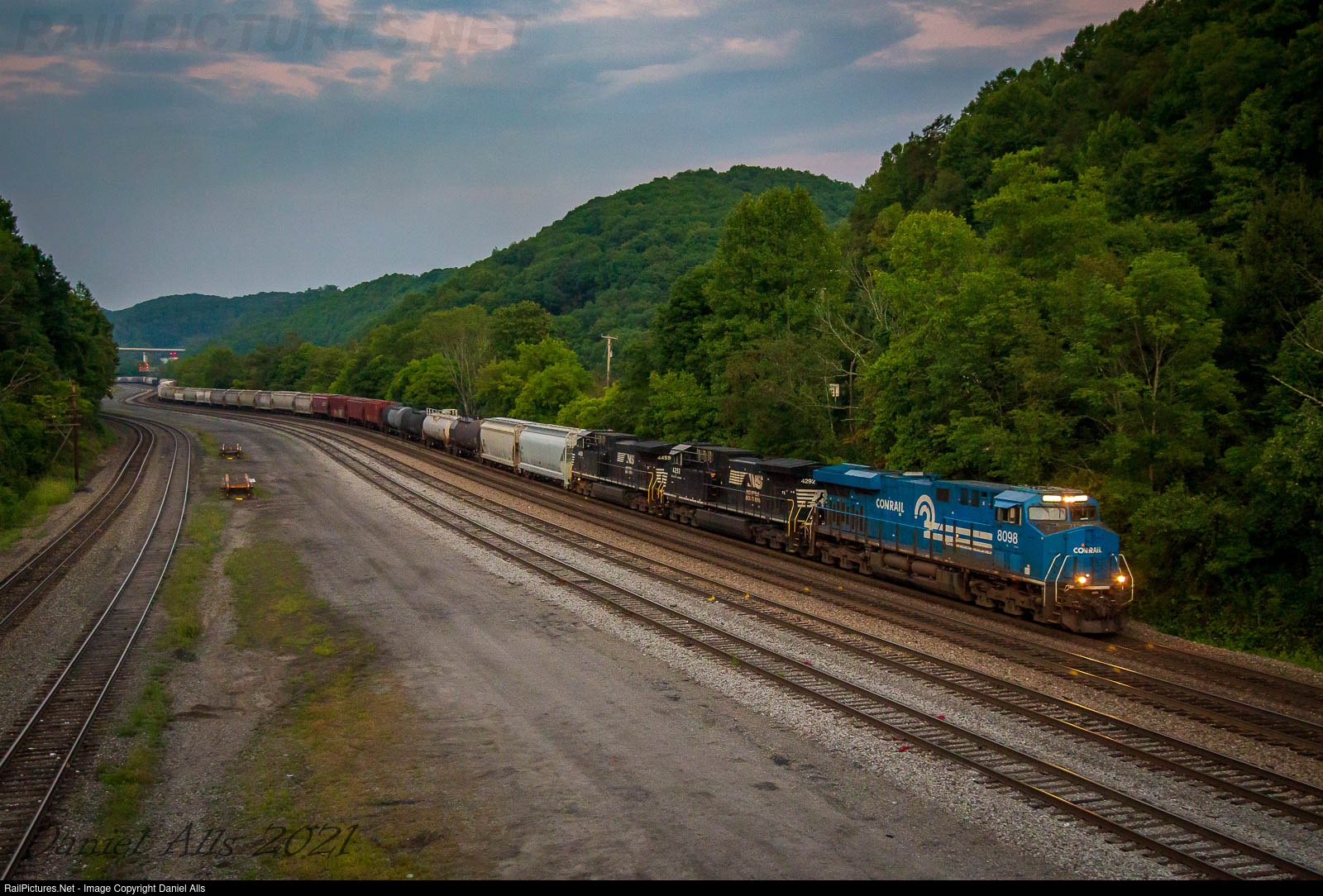 | The last shot of the 393 chase comes here at the east end of Bluefield yard. The Conrail heritage unit leads the train toward a crew change about a mile ahead as the last light of the day is upon us. |