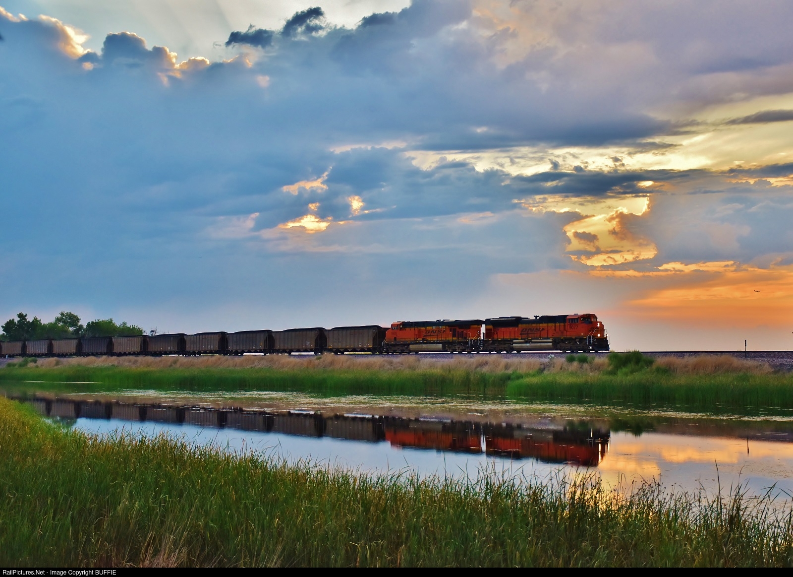 | BNSF 9077 (SD70ACe) leads a coal train at sunrise past Barr Lake on the Brush Sub as it heads towards Denver, Colorado. |