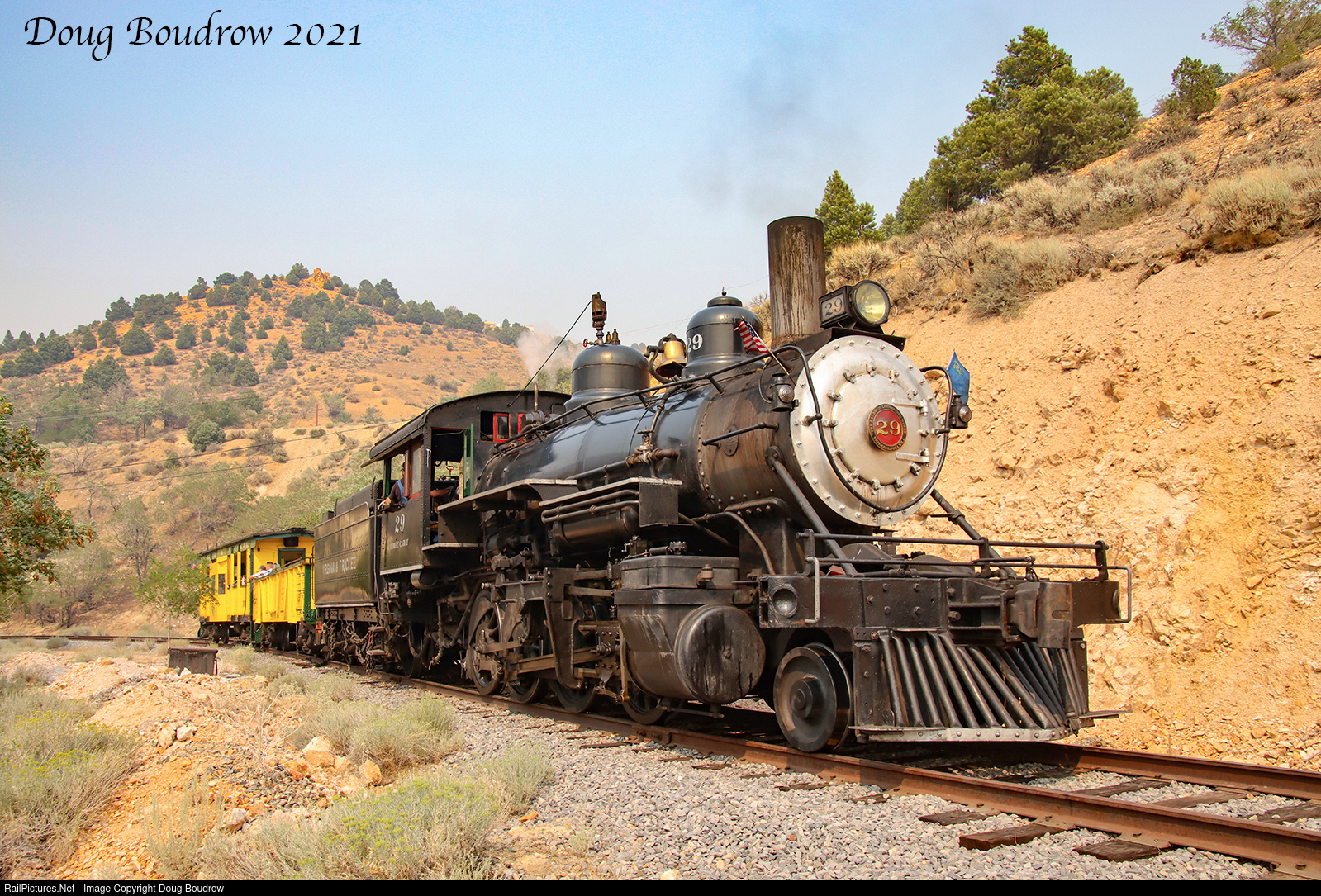 | The 3 pm Virginia & Truckee train is seen at Gold Hill. Locomotive #29 is a 2-8-0, Ex-Longview, Portland and Northern Railway No. 680. The engine was built by Baldwin Locomotive Works in October 1916. |