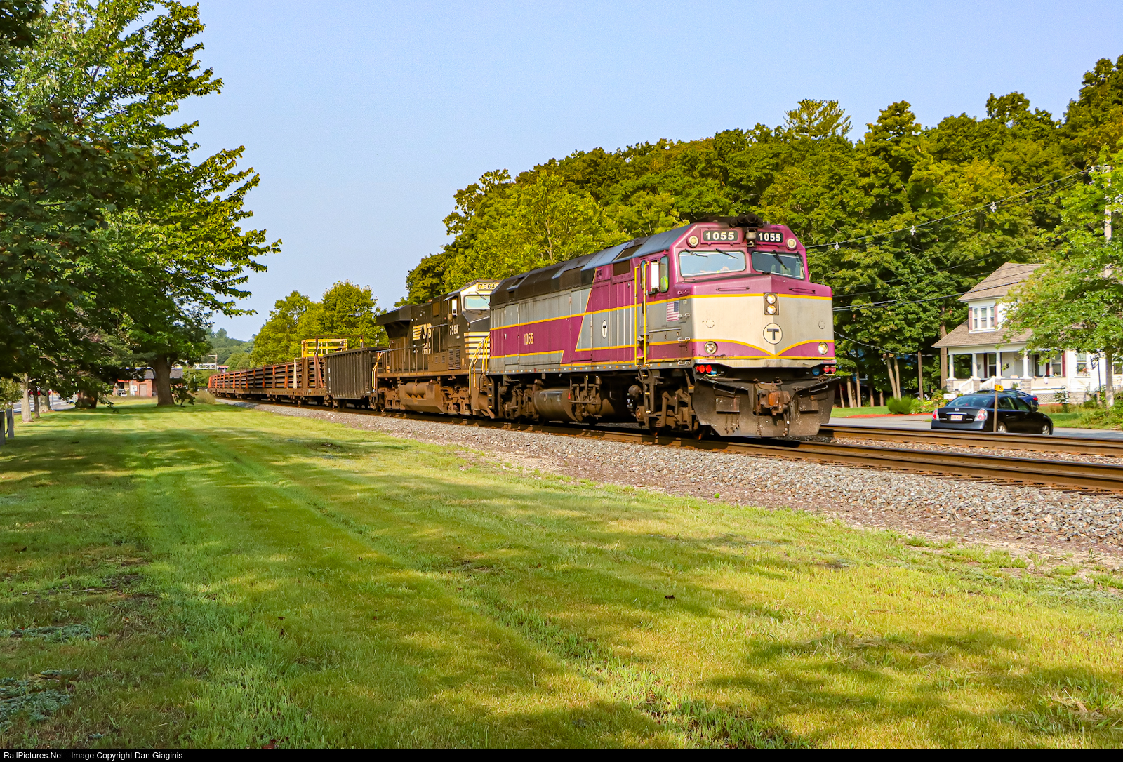 | Norfolk Southern to Boston: A Keolis Welded Rail Extra cruises past the MBTA Station in Shirley, MA on a beautiful August morning on their way into Boston. To comply with the ACSES II mandate east of the Westminster, MA layover facility, the “T” work train crew had to add one of their own locomotives to the inbound power. This made for quite the interesting passenger-freight locomotive combo of MBTA F40PH-2C #1055 leading NS ES44DC #7564. It’s not every day you can see something like this! |