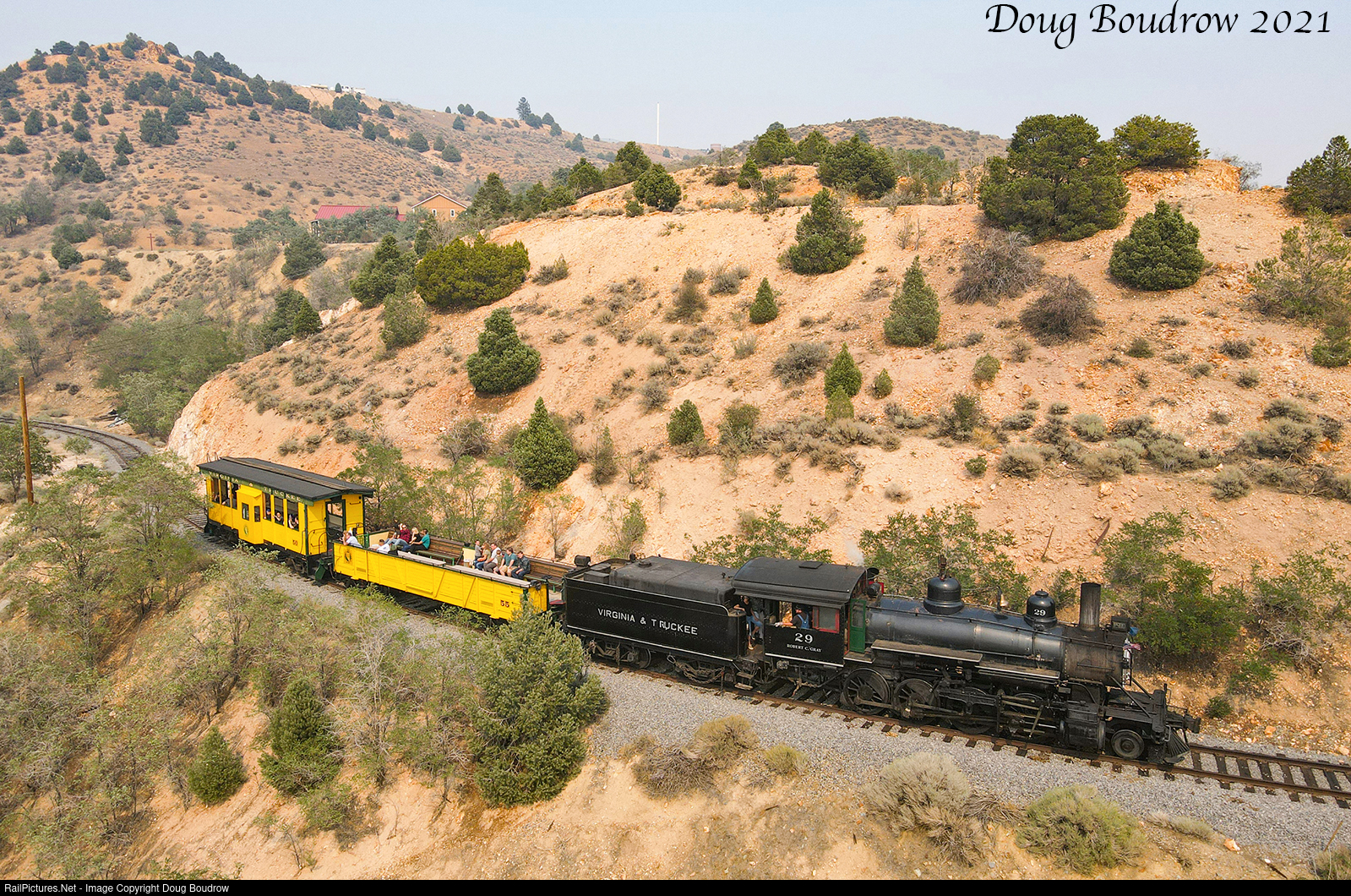 The 3 pm Virginia & Truckee train is seen at Gold Hill. Locomotive #29 is a 2-8-0, Ex-Longview, Portland and Northern Railway No. 680. The engine was built by Baldwin Locomotive Works in October 1916.