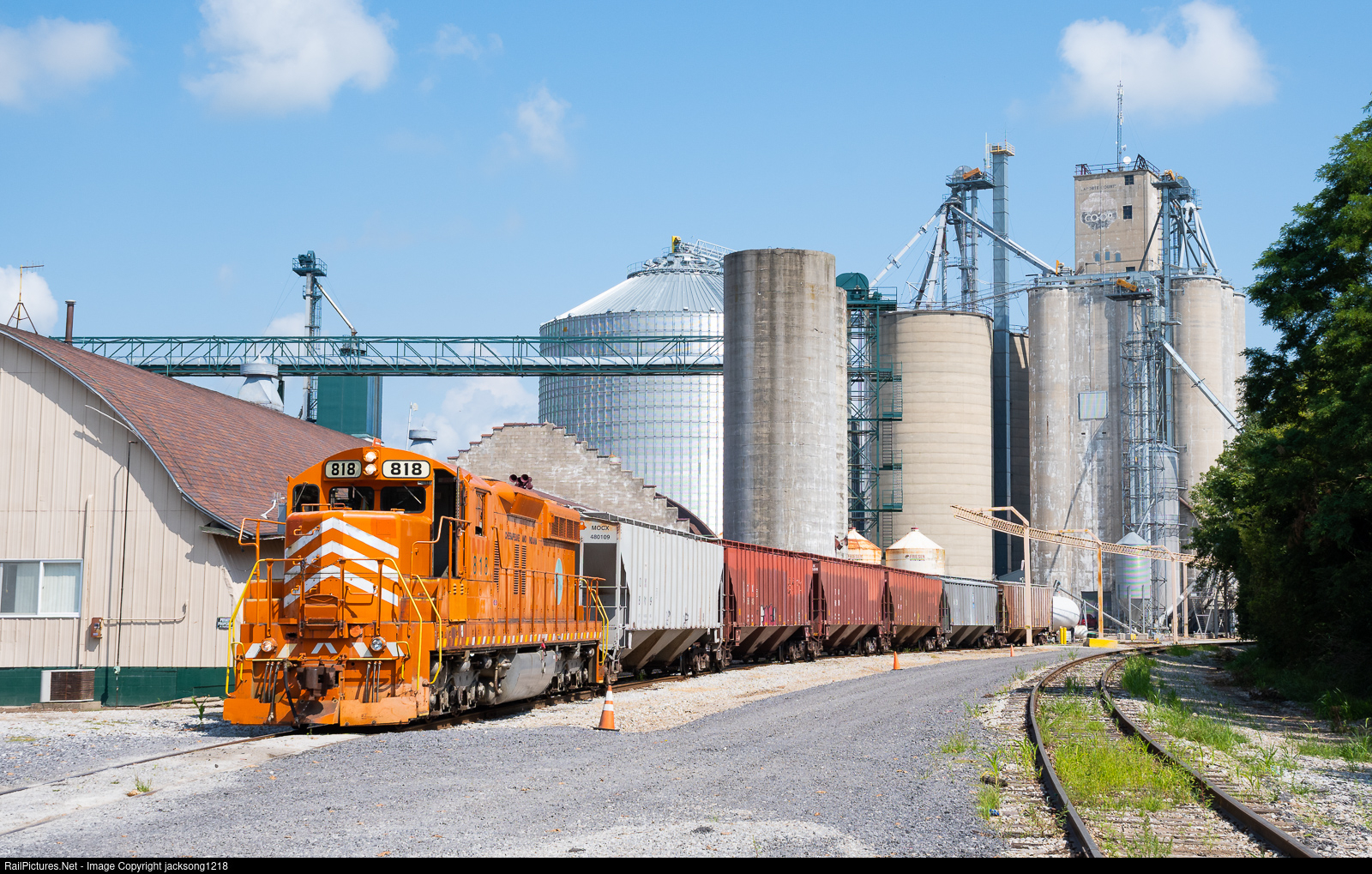 Chesapeake and Indiana EMD SD-M number 818 is still wearing its EJ&E paint as it switches a cut of fertilizer hoppers at the Co-Alliance facility in Union Mills, IN. It was recently announced that the 818 will be donated to the Hoosier Valley Railroad Museum, and the rest of the CKIN SD-M fleet is to be sold and or scrapped. Before putting the unit on the interchange for transport to HVRM, the evelator crew fired it up for one last revenue move, ending its 62 years of revenue service.