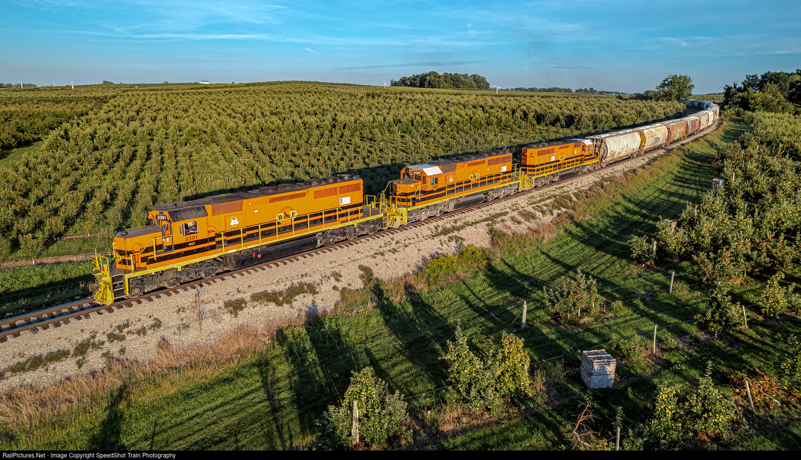 | MQT 3391 (Z151) Leads a trio of locomotive manifest train North thru Casnovia Michigan apple orchard near sunset on its way to Baldwin Michigan from Sparta |