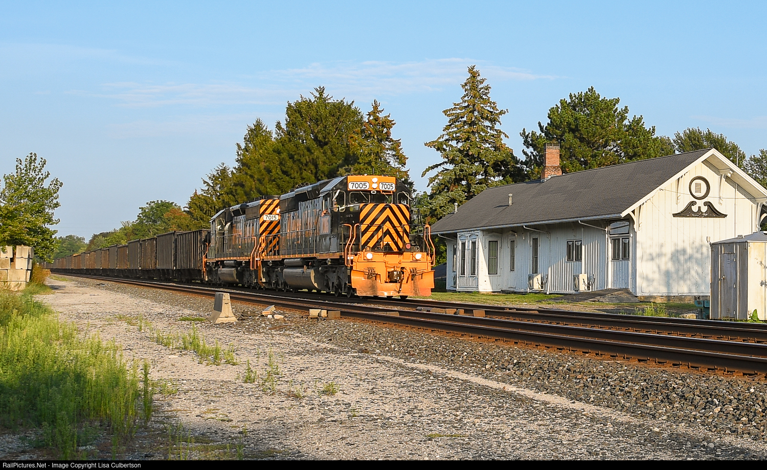 A couple of days ago, we got word that a pair of Wheeling and Lake Erie engines would be passing through town. Definitely not something you see every day here! They finally appeared today, just as the light was fading. Shown here, they are rolling west past the former Lake Shore and Michigan Southern Railway depot near downtown Vermilion, Ohio.