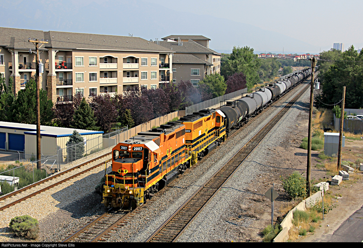 | The RUT312 is a pretty good size train tonight, at this point 24 cars. GP38-3 2007, and GP40-3 3002 are on a slow roll through Murray, Utah. |