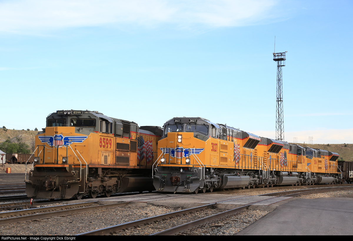 Sitting side by side in front of the Helper, Utah Yard Office are these two EMD SD70ACe’s. On the right is UP 3027, an SD70ACe-T4 built in 2017 and just arrived at Helper with the MNYRO. To its left is the UP 8599, a plain-jane SD70ACe built in 2007. Many differences in their respective front end details are visible, ie. headlight placement, windshield shape, logo position, pilot plow shape, truck design, and details of the slanted part of the nose. There are several more changes, some major, further back on the car body. Locomotive evolution in plain sight.