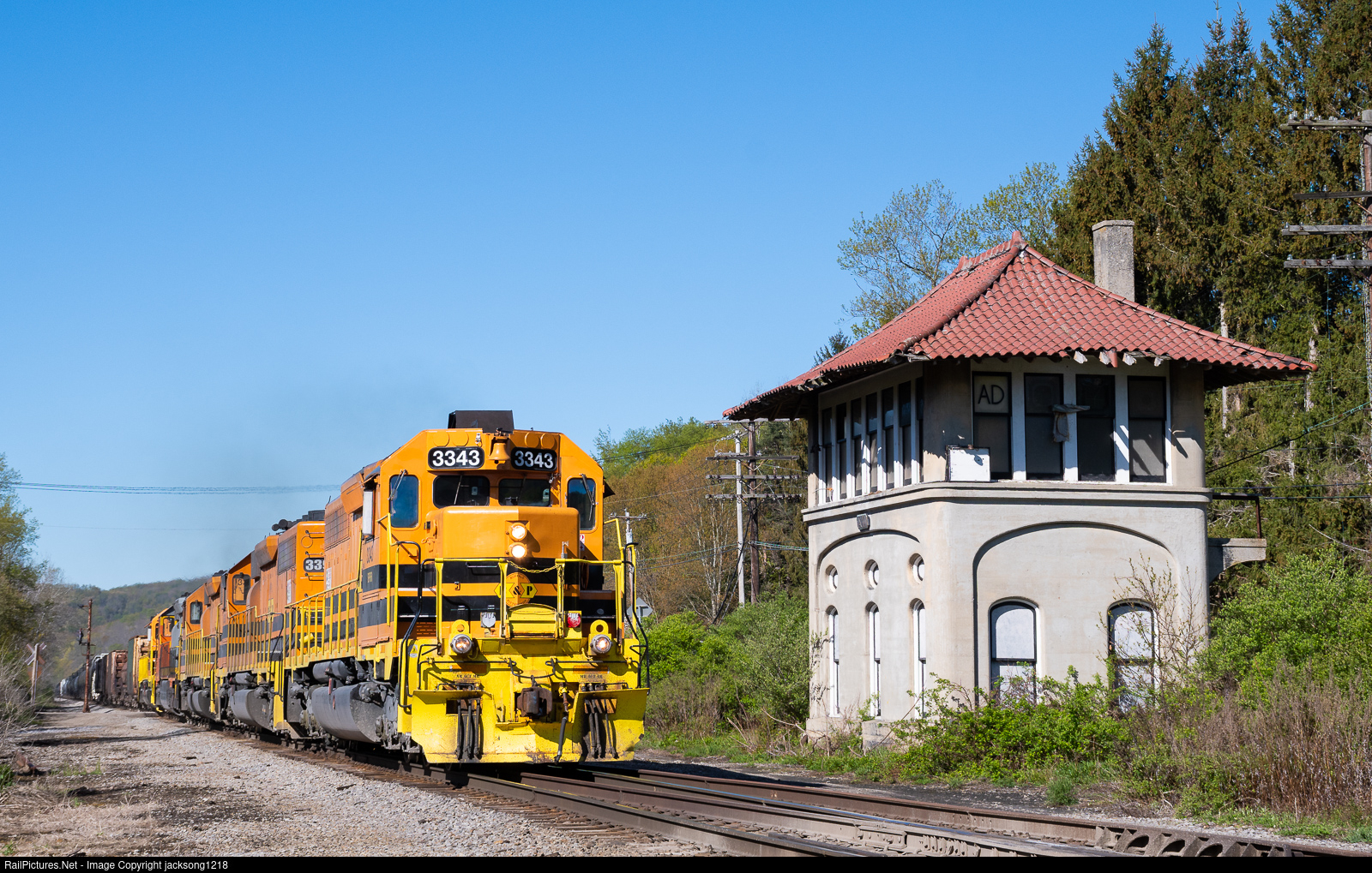 | Buffalo and Pittsburgh train SIBF (Salamanca, NY - Buffalo, NY) works its way northbound as it passes the ex BR&P interlocking tower at Ashford Junction with a quintet of EMD SD40 variants for power. The normally nocturnal SIBF ran in daylight the week of 5/10/21 due to trackwork south of Salamanca. |