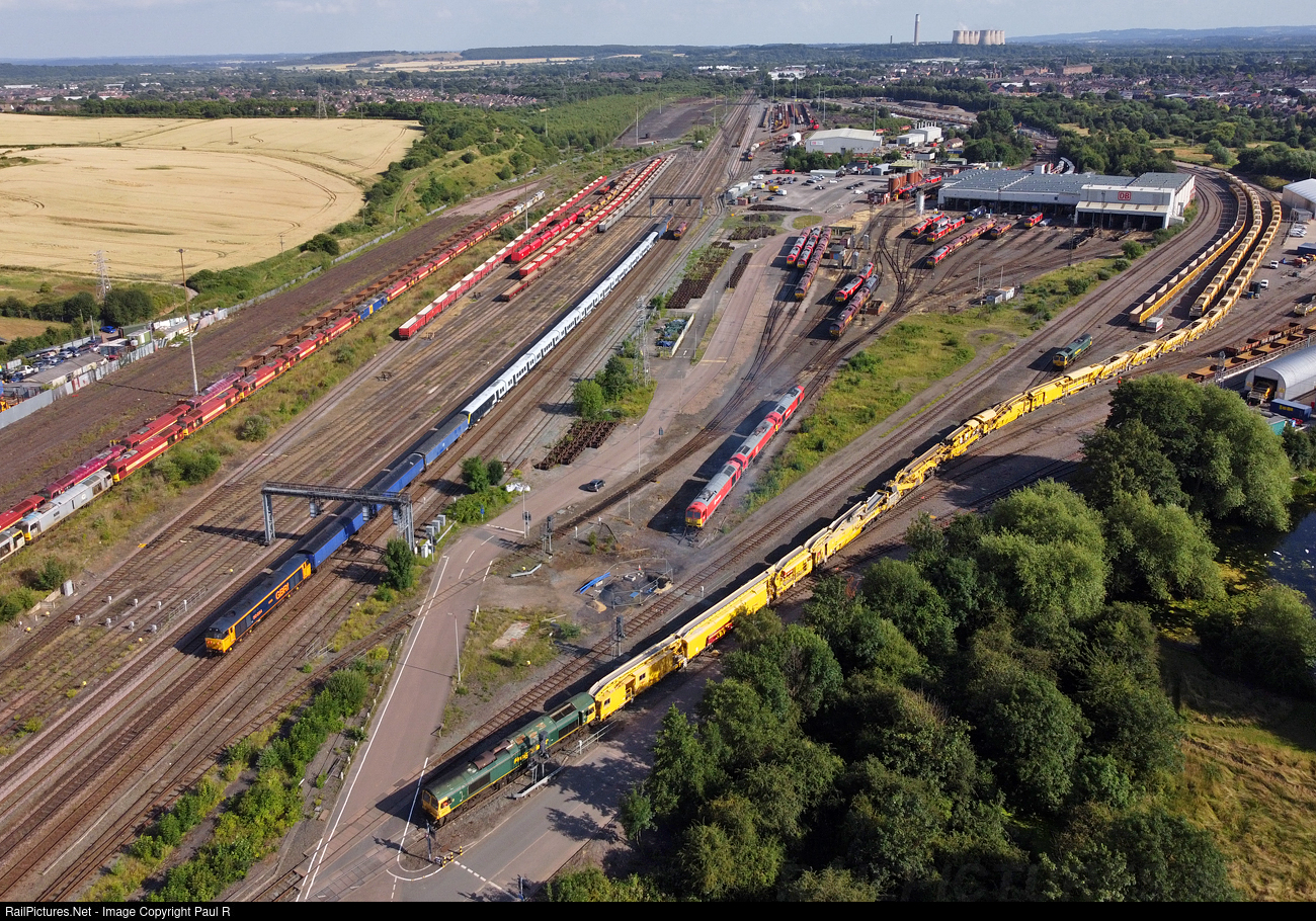 50007 (numbered 50034 and named Furious on this side) tails 50049 through Toton on 190721 with 701024 on 5Q14 1501 Worksop-Derby Litchurch Lane, whilst 66510 shunts a HOBC train in Sandiacre sidings. Taken by drone.
