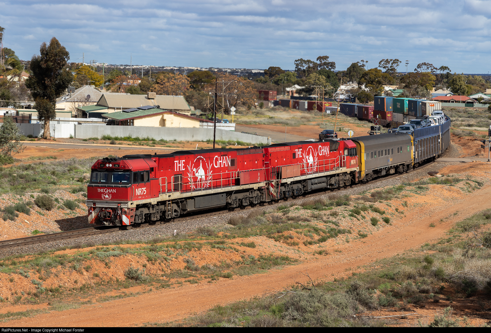 | State border restrictions has put a temporary end for various cruise passenger trains such as The Ghan and Indian Pacific. As a result, NR Class locomotives painted up for these passenger trains have been put into general freight pool. Getting 1 on a freight train is becoming common. But getting a matching set is well worth getting 2-3 shots of it. Seen here passing under the Goldfields Highway through Kalgoorlie. It will soon commence its long journey across the Nullabour Plain. |