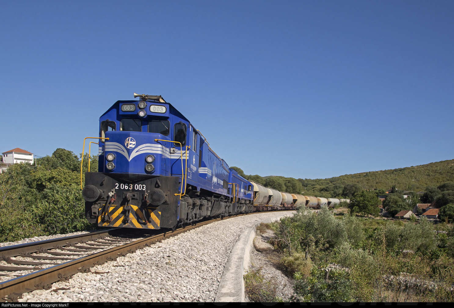 | A pair of Croatia's EMD machines are provided for the daily cement train to tackle the big climbs on this route. Here its seen rolling downhill through the tiny village of Bakovic on route to Knin. |