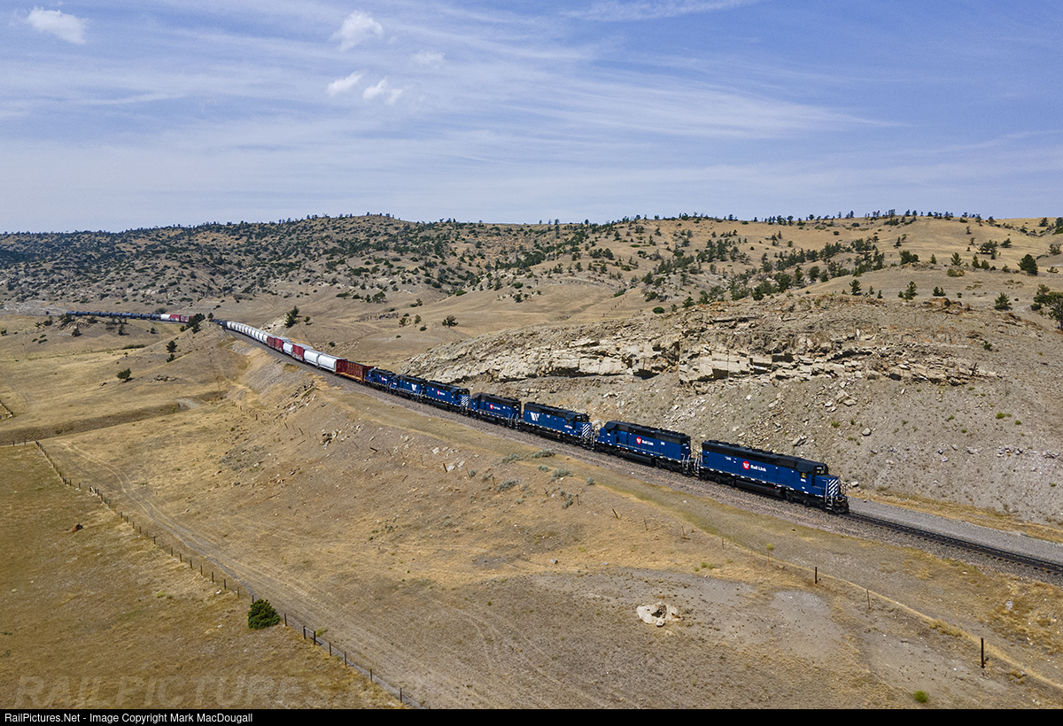 A late, recrewed 7 unit R-LAUBOZ drops downgrade into Livingston with an SD45 leading 3 SD40-2XRs, 2 GP35s and a GP9. Quite a consist for 2021!